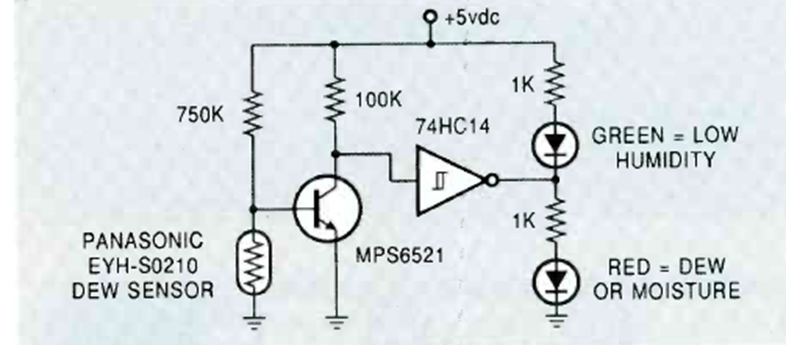Este circuito también detecta IR proporcionando indicación en los LED. El circuito se utiliza para indicar la humedad en pruebas de banco. Lo encontramos en la revista Radio Electronics de febrero de 1990.
