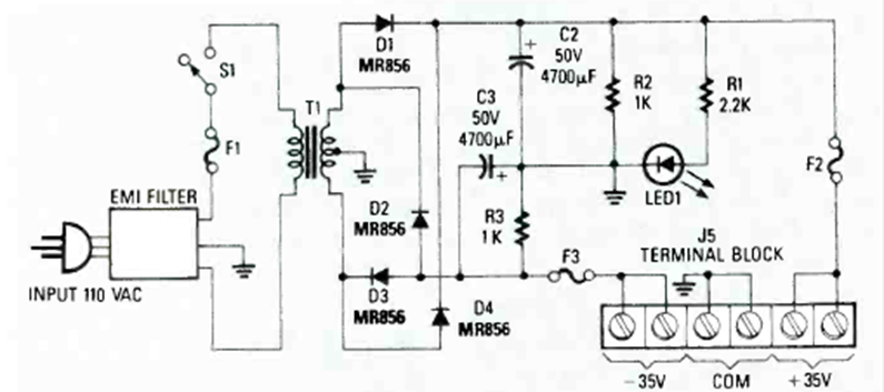 Esta fuente se encontró en el mismo número especial de 1990 de la revista Radio Electronics Experimenter que describe un amplificador de hasta 100 W por canal con el LM12.