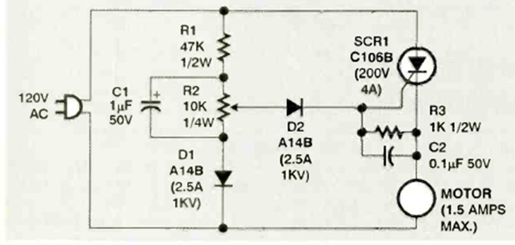 Este control de motor de máquina de coser se encontró en la edición de diciembre de 1997 de la revista Electronics Now. El circuito de media onda utiliza un SCR tipo 106.