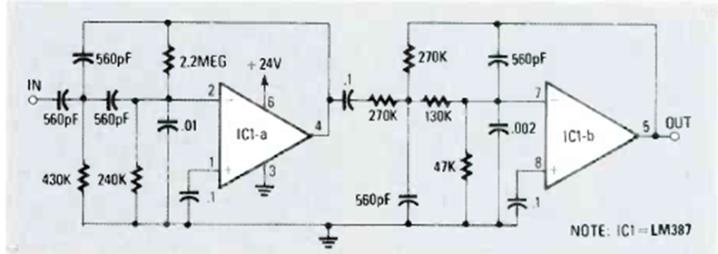 Este circuito deja pasar el rango de 300 Hz a 3 kHz que corresponde a la voz humana. Lo encontramos en la revista Radio Electronics de febrero de 1990. El circuito utiliza ambas las partes del LM381.