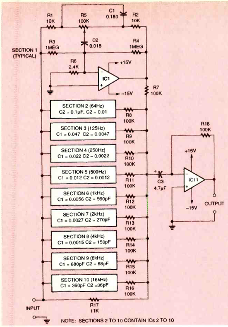 En este circuito tenemos los detalles de una sección con las demás repitiéndose con los valores indicados en el diagrama. El circuito es de Electronics Now de marzo de 1995 y la fuente de alimentación debe ser simétrica.