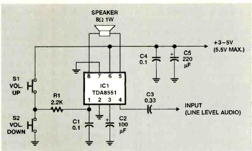 Este interesante circuito para el RDA8851 permite obtener dos volúmenes con un simple toque. El circuito es de Electronics Now de diciembre de 1988. Tenga en cuenta los voltajes del amplificador.