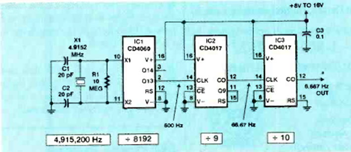 Encontrado en la edición de noviembre de 1999 de la revista Electronics Now, este circuito genera una señal de 6,67 Hz a partir de un cristal de 4,1952 Hz.