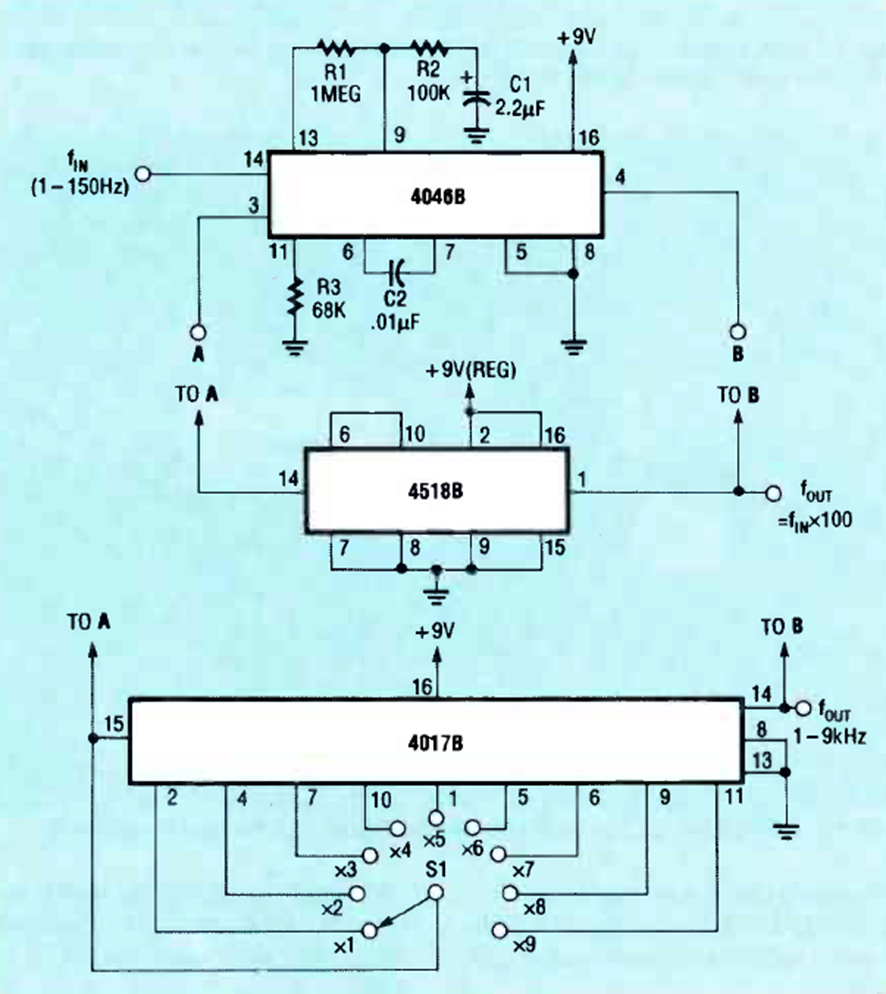 Encontramos este circuito CMOS basado en el PLL4046 en la revista Radio Electronics de diciembre de 1989. El circuito está alimentado por una tensión de 9 V.