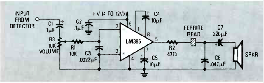 Este circuito sirve como salida de audio para radios AM o incluso FM y fue encontrado en una revista de Radio Electronics de marzo de 1990. Tenga en cuenta las tensiones de alimentación.