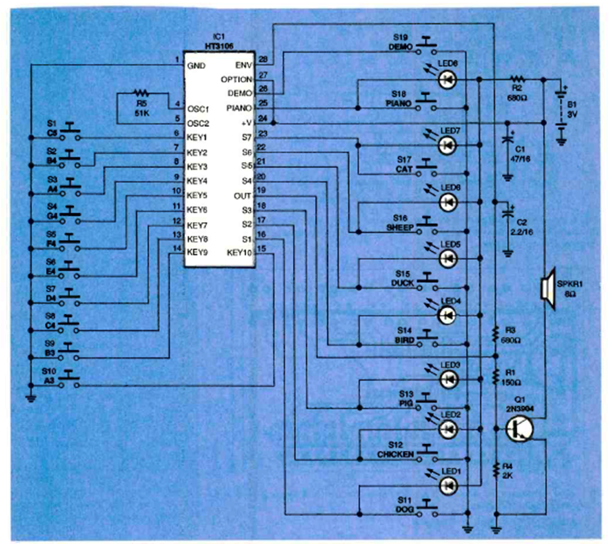 Utilizando un circuito integrado que estaba disponible en ese momento, este circuito produce sonidos de animales como mugidos, cantos de gallo, etc. El circuito es de una revista Electronics Now de marzo de 1997.
