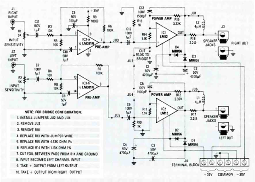 Este amplificador de alta potencia con sólo 4 circuitos integrados fue encontrado en el número especial de 1990 de la revista Radio Electronics Experimenter. El circuito alcanza los 100 W por canal.