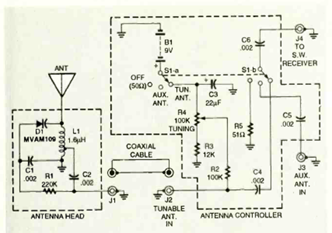 Este preselector de onda corta fue encontrado en la edición de julio de 1994 de la revista Radio Electronics. El circuito es adecuado para antenas telescópicas, adaptando la impedancia al receptor utilizado.