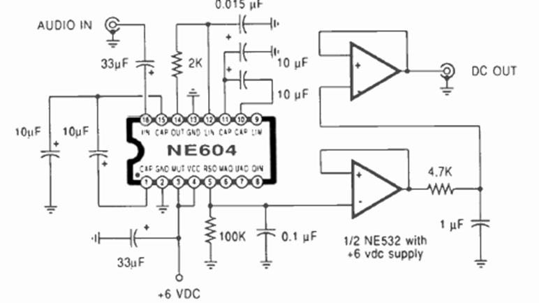 El propósito de este circuito es medir la intensidad de las señales de audio. Lo encontramos en la revista Radio Electronics de septiembre de 1990. El circuito funciona como un medidor S.