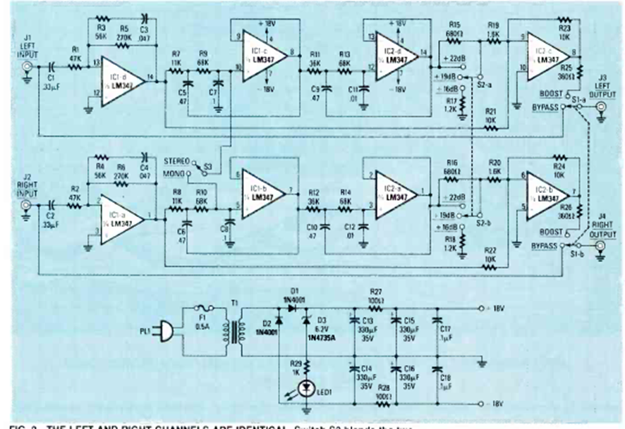 Este circuito consta de un filtro de graves que puede utilizarse como subwoofer en un sistema de sonido. El circuito es de una Radio Electronics de mayo de 1988.