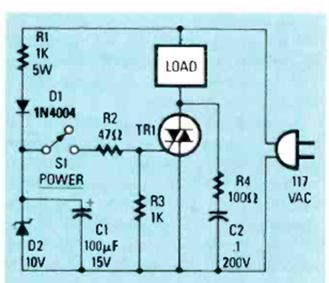 Este circuito se encontró en la edición de octubre de 1987 de la revista Radio Electronics. El triac debe controlarse según la carga y montarse en un disipador de calor.