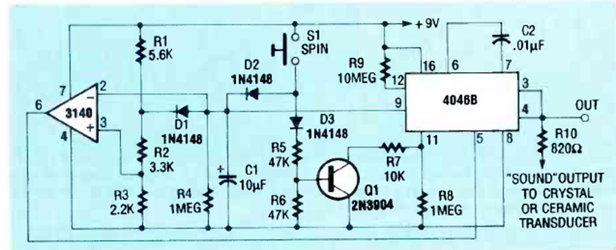 Este circuito con un PLL 4046 fue encontrado en la revista Radio Electronics de diciembre de 1989. El circuito produce los clics de una ruleta a velocidad decreciente.