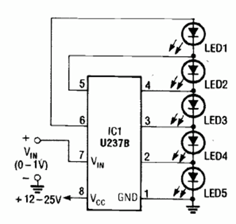 Este circuito de escalado de LED lineal se encontró en la revista Radio Electronics de febrero de 1992. Tenga en cuenta que la corriente está limitada a 20 mA por el propio CI, por lo que no hay necesidad de resistencias. La escala es de 0 a 1 V.