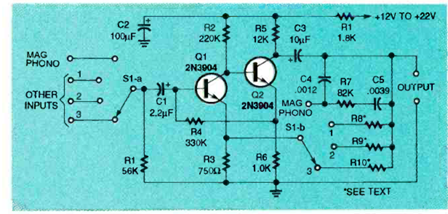 Encontramos este circuito preamplificador universal en un Elecronics Now de marzo de 1994. Tiene varios tipos de ecualización dependiendo de la señal de entrada.
