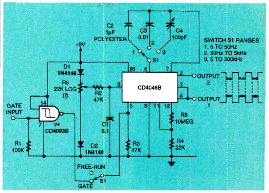 Este circuito utiliza un PLL poco común que es el 4046 CMOS. Lo encontramos en la revista Electronics Now de octubre de 1994. El circuito también utiliza una puerta 4093 como disparador.