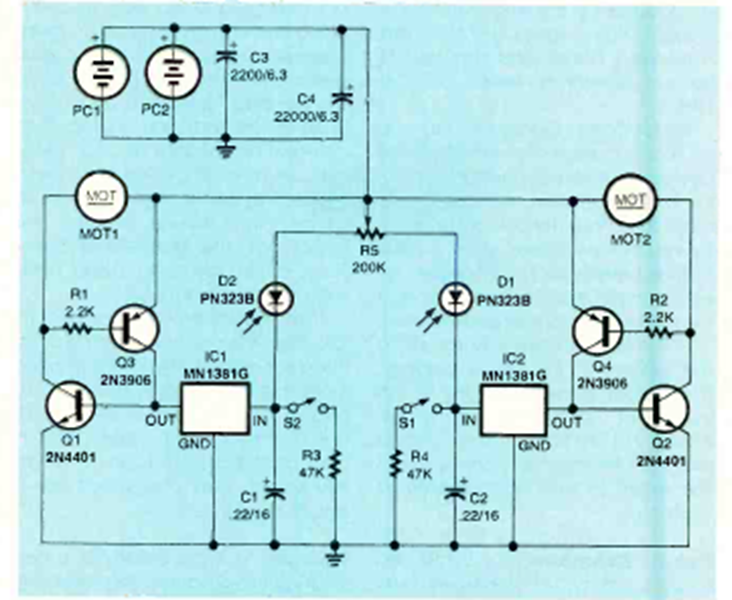 Este circuito alimentado por células fotovoltaicas fue encontrado en la edición de noviembre de 1998 de la revista Electronics Now. El circuito utiliza dos motores y puede seguir una línea gracias a sus sensores.