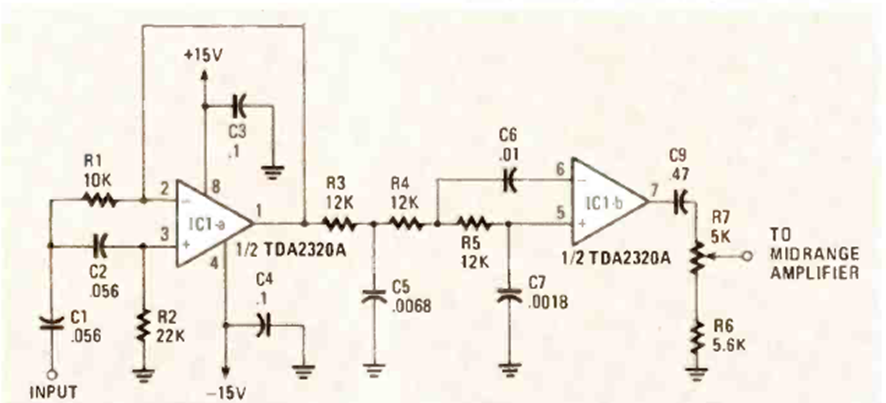 Este filtro de rango medio para un sistema de sonido se encontró en la edición de mayo de 1988 de la revista Radio Electronics. El circuito se basa en un amplificador dual que debe ser alimentado por una fuente simétrica.