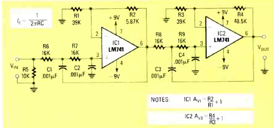 Este filtro se encontró en la edición de mayo de 1989 de la revista Radio Electronics. Los componentes se pueden modificar para que funcionen en otras frecuencias. La fuente debe ser simétrica.