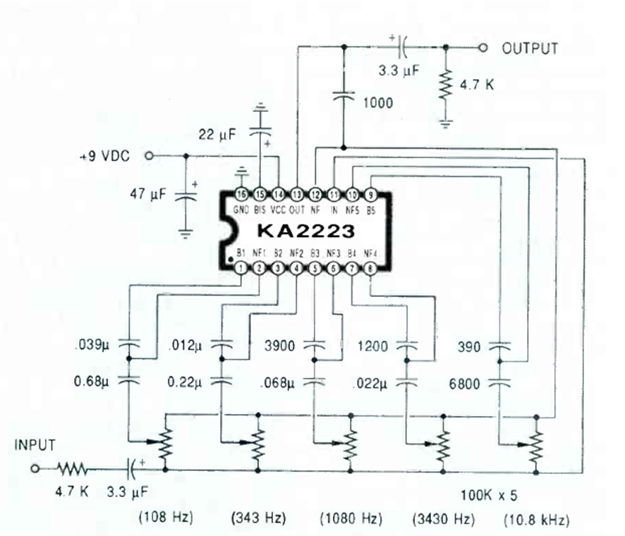 Este circuito fue encontrado en una Radio Electrónica de abril de 1990. El circuito tiene 5 bandas de ecualización dadas por los capacitores utilizados.