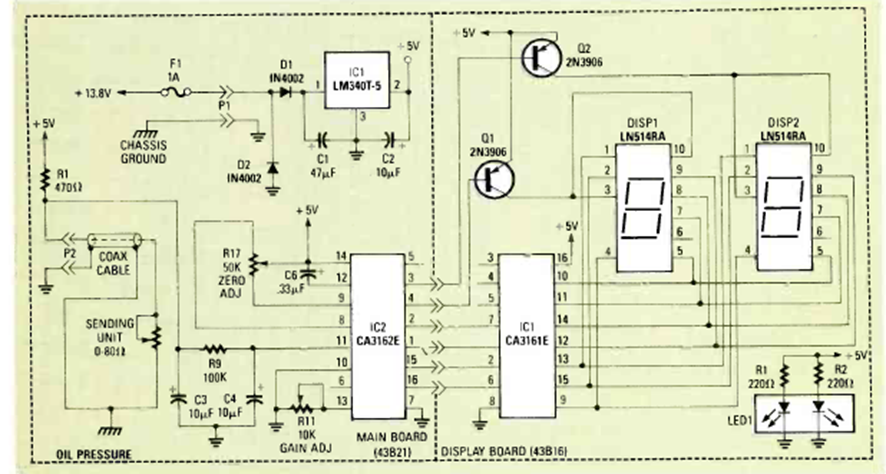 Este circuito se encontró en la revista Radio Electronics de julio de 1990. Está basado en los circuitos integrados indicadores de 3 dígitos CA3161 y CA3162.