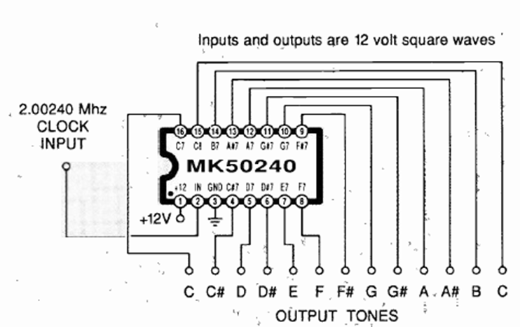 Encontramos este circuito para instrumentos musicales en la revista Radio Electronics de marzo de 1992. El circuito tiene salidas según la escala deseada a partir de un oscilador de cristal a la frecuencia indicada.