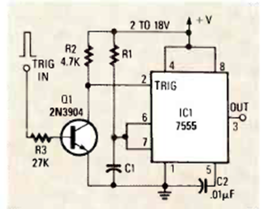 Encontramos este circuito en una revista de Radio Electronics de abril de 1988. El tiempo de salida viene dado por R1 y C1.