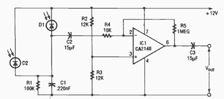 Este circuito sensor de luz infrarroja se encontró en la revista Radio Electronics de julio de 1992. Está sintonizado para luz modulada de 20 kHz.