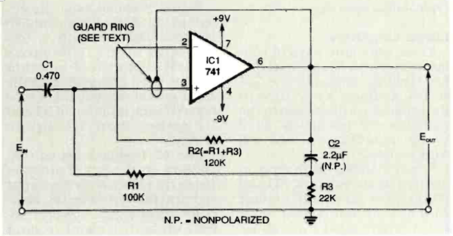Este circuito fue encontrado en la edición de enero de 1995 de la revista Electronics Now. La fuente debe ser simétrica y se debe utilizar un anillo de protección contra el ruido.
