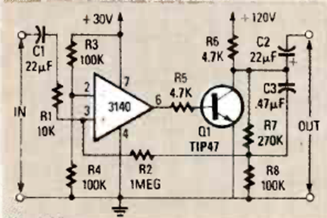 En la figura tenemos la forma de obtener una mayor corriente de salida para un amplificador operacional. Con los componentes indicados la corriente de salida es de 50 mA. Este valor se puede cambiar.