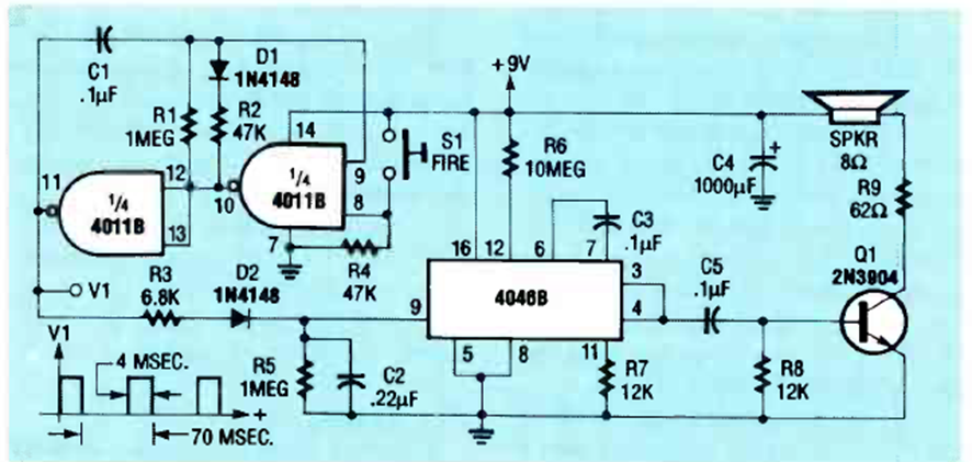 Este circuito de efectos de sonido que imita una pistola se basa en el PLL4066. El circuito fue encontrado en la edición de diciembre de 1989 de la revista Radio Electronics y ya incluye una pequeña etapa de amplificación.