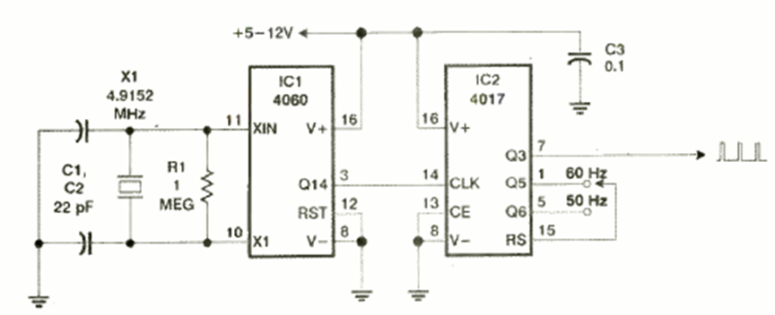 Este circuito basado en cristales puede generar señales precisas de 50 o 60 Hz. El circuito es de una revista Electronics Now de noviembre de 1998. La señal de salida consta de pulsos rectangulares.
