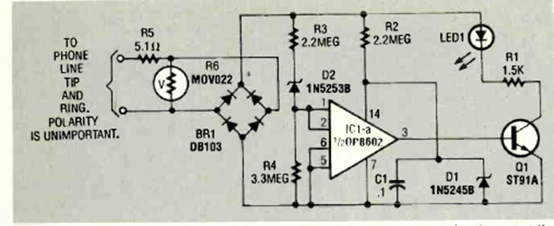 Este circuito para linha telefônica analógica com extensão monitora quando a linha está em uso. Encontramos na revista Electronics Now de novembro de 1996.