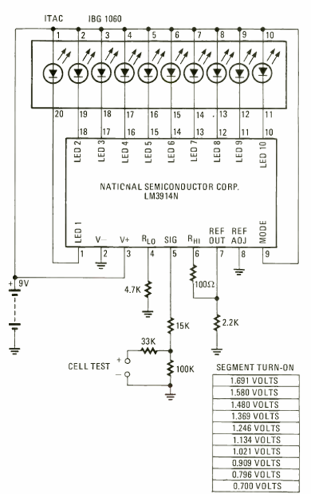 Este circuito con el LM3914 fue encontrado en la Radio Experimenter Special Projects de 1990. El circuito tiene la tabla que indica el voltaje en el que se encienden los LED.