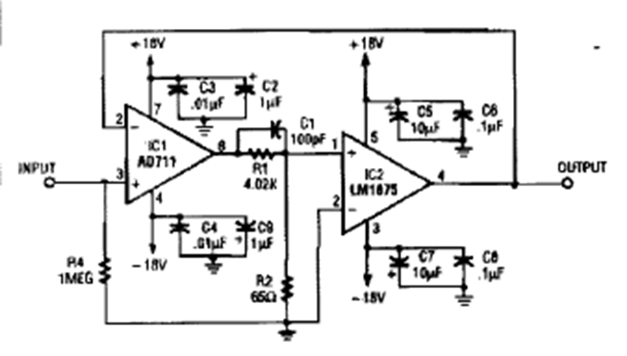 Encontrado en la revista Electronics Now en un número de los años 90, este circuito se diferencia del anterior porque invierte la fase de la señal aplicada al altavoz. La fuente debe ser simétrica a 18 V.