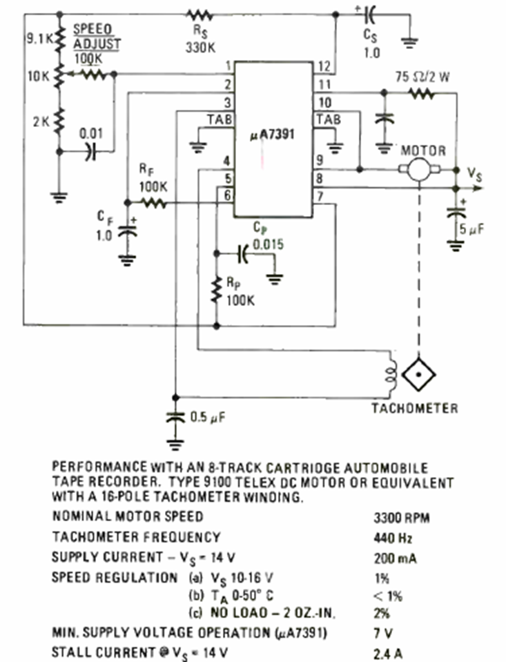 Este control de velocidad del motor con sensor de tacómetro se encontró en la Radio Experimenter Special Projects de 1993. La corriente máxima es 2,4 A.