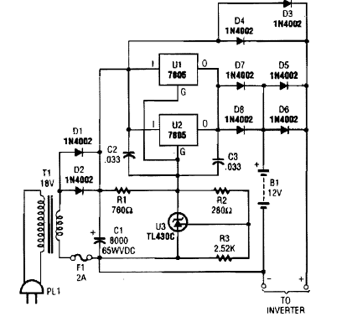 Este cargador se encontró en una edición de la década de 1990 de la revista Popular Electronics. Los circuitos integrados deben estar equipados con un disipador de calor.