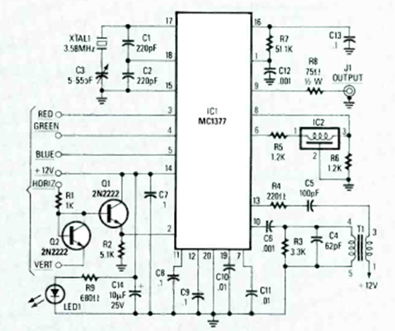 Este circuito se encontró en el manual del experimentador electrónico de 1991. Se puede utilizar para mostrar señales RGB en televisores NTSC antiguos.