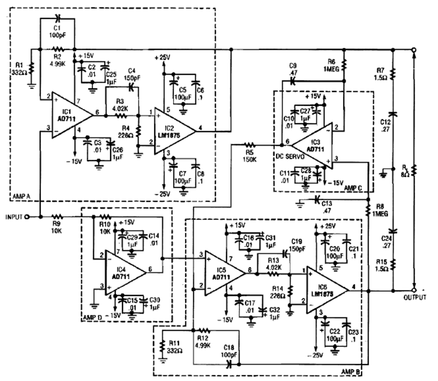 Este amplificador se obtuvo de una Electronics Now de los años 90. El circuito tiene una fuente de alimentación simétrica de 26 V. Los circuitos integrados de potencia deben estar equipados con buenos disipadores de calor.