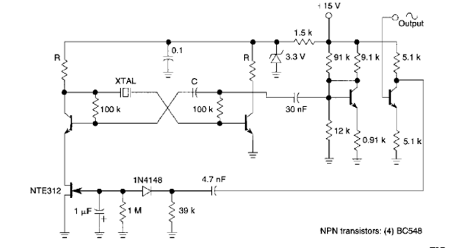 Este circuito oscilador de baja frecuencia se encontró en una Electronic Design de los años 90. Los transistores son comunes y la frecuencia la proporciona el cristal.