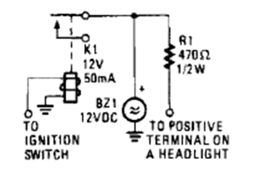 Encontrado en un Popular Electronics de la década de 1990, este circuito mantiene un zumbador activado si el coche se apaga con las luces delanteras encendidas. El relé es de 12 V y baja potencia.
