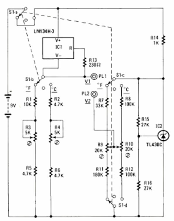Encontramos este circuito en Electronics Experimenter Special Projects de 1981. El circuito era un sensor integrado común en ese momento. La alimentación proviene de una batería de 9 V.