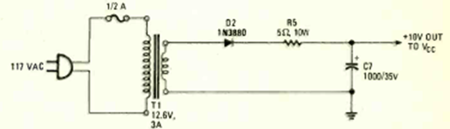 Esta fuente de alimentación para el generador de iones del circuito anterior no necesita regulación, por lo que proporciona una buena corriente. El circuito se encontró en la misma revista y requiere un transformador de al menos 3 A.