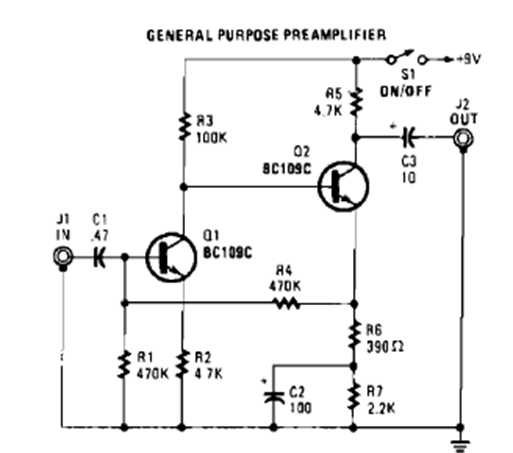 Encontrado en la Enciclopedia de Circuitos Electrónicos, Volumen 5 de 1995, este circuito tiene una ganancia determinada por R4 y R6, que se puede modificar. Los transistores son de propósito general.