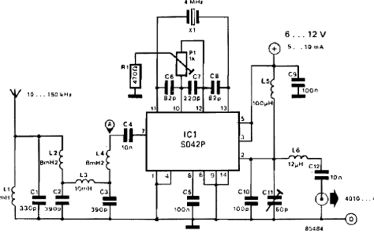 Con este circuito, se pueden recibir señales en el rango de 10 kHz a 150 kHz a una frecuencia cercana a los 4 MHz desde un receptor de onda corta. El circuito es de una 303 Circuits de los años 90.