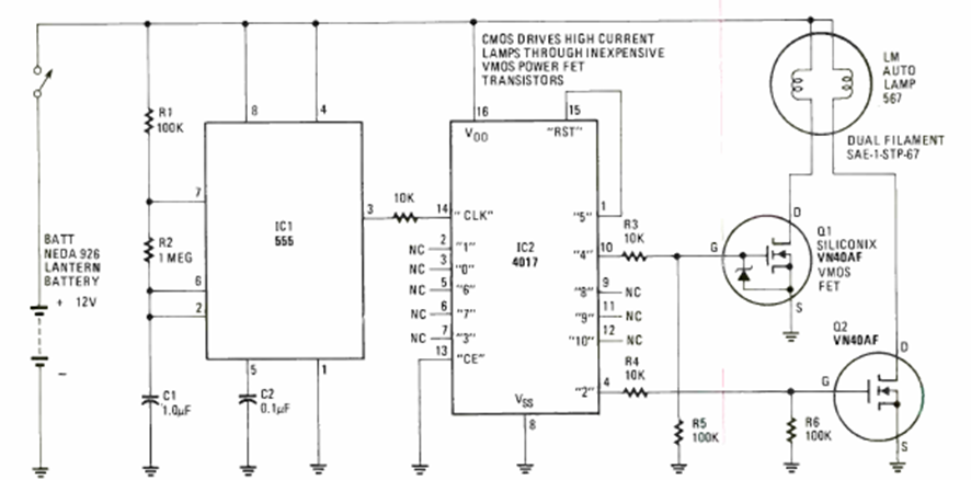 Encontramos este circuito en la Electronics Experimenter Special Projects de 1981. Los transistores son MOSFET de potencia de la época. Se pueden utilizar equivalentes actuales.