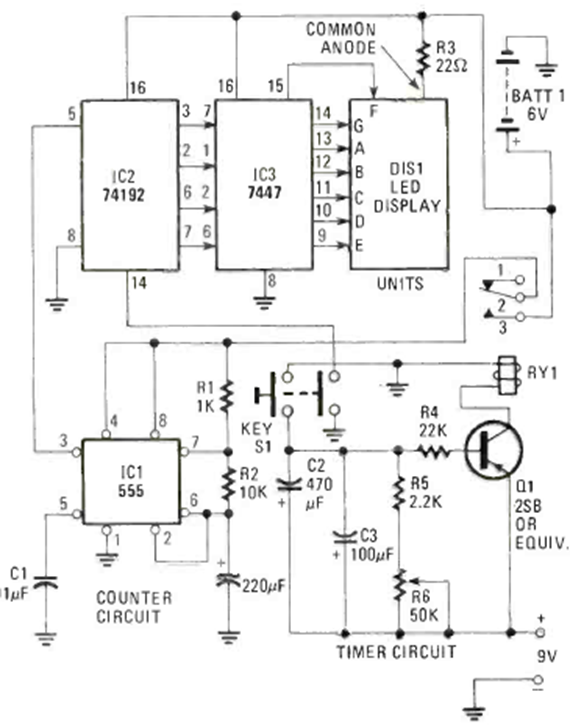 Este circuito con componentes comunes se encontró en la Electronics Experimenter Spcial Projects de 1983. El circuito tiene un temporizador de cuenta regresiva y acciona un relé.
