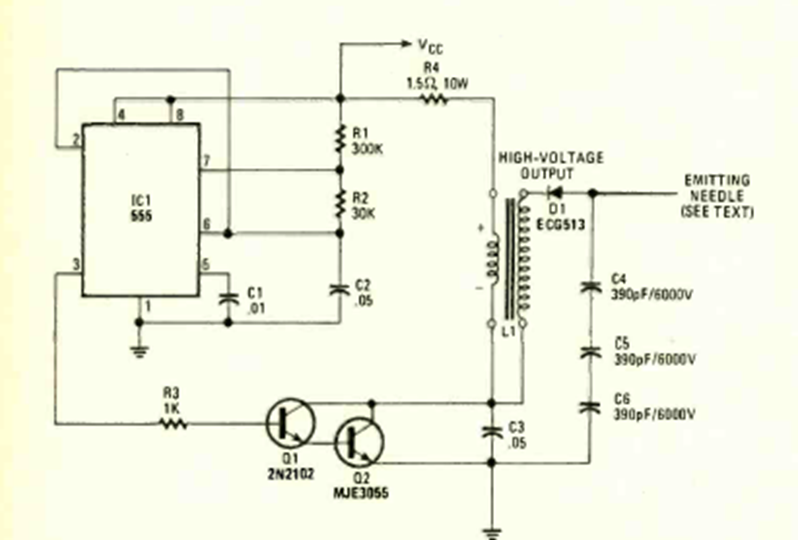 Este sencillo circuito utiliza una bobina de encendido de automóvil. El circuito apareció en la edición anual de Radio Electronis de 1983. El circuito admite transistores equivalentes.