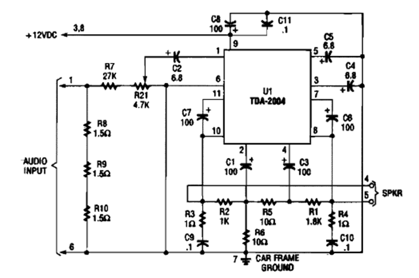 Este amplificador de audio para coche se encontró en un manual de aficionados a la electrónica popular de la década de 1990. El circuito utiliza el TDA2004 para amplificar la salida de radio de los coches de la época.
