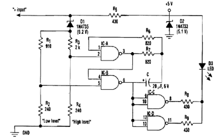 Este circuito, basado en puertas lógicas CMOS, se encontró en una Electronic Design de los años 90. El circuito es para voltajes de 11 a 1 V, pero se puede modificar.