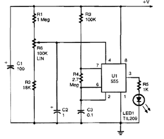 Este circuito se encontró en un Popular Electronics de los años 90. El circuito con el 555 monitoriza el voltaje de salida de una fuente de alimentación, ajustado mediante un potenciómetro.